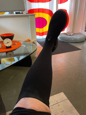 Michèle B. 08/08/2025Acheteuse vérifiéeElles montent juste sous le genou, la compression est parfaite et elles tiennent bien. Les couleurs sont top. Bien rembourrées, faciles à enfiler, je les porte environ 14 heures par jour et elles ne rendent pas mes jambes moites ni inconfortables. Ça gratte un peu quand je les enlève, mais je pense que c’est normal.